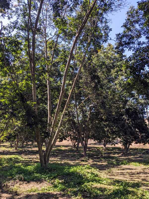 Sur plusieurs dizaines d’hectares, les arbres sont cultivés en agriculture biologique, selon des pratiques agroécologiques qui respectent les cycles naturels et favorisent la biodiversité. L’irrigation est assurée par un système goutte-à-goutte, limitant la consommation d’eau.